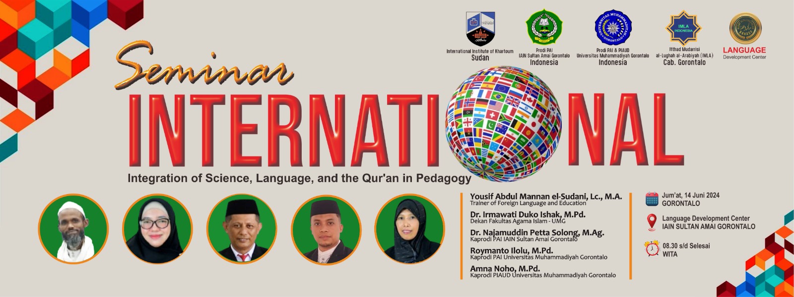 Pada hari Jum’at, 14 Juni 2024, telah diadakan Seminar Internasional dengan topik yang sangat menarik, yaitu “Integration of Science, Language and the Qur’an in Pedagogy” di Language Development Center IAIN Sultan Amai Gorontalo dihadiri oleh 50 Peserta terdiri dari Dosen dan Mahasiswa IAIN Sultan Amai Gorontalo dan Universitas Muhammadiyah Gorontalo.